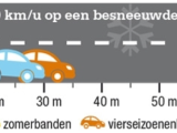 Winterbanden zijn uit een andere rubbersamenstelling opgetrokken dan zomerbanden. Verder hebben winterbanden een heel ander profiel met extra lamellen. Dat zorgt voor meer grip. In de afbeelding hieronder zie je precies het verschil in remweg op sneeuw met wintebanden en all seasonbanden en met zomerbanden. Ter vergelijking: op droog wegdek is de gemiddelde remweg 12 meter en op nat wegdek 15 meter. De remweg op sneeuw is ook met winterbanden zó lang dat je je rijstijl aan moet passen. Rijden op sneeuw met zomerbanden is simpelweg gevaarlijk, dan helpt ook een aangepaste rijstijl niet meer.